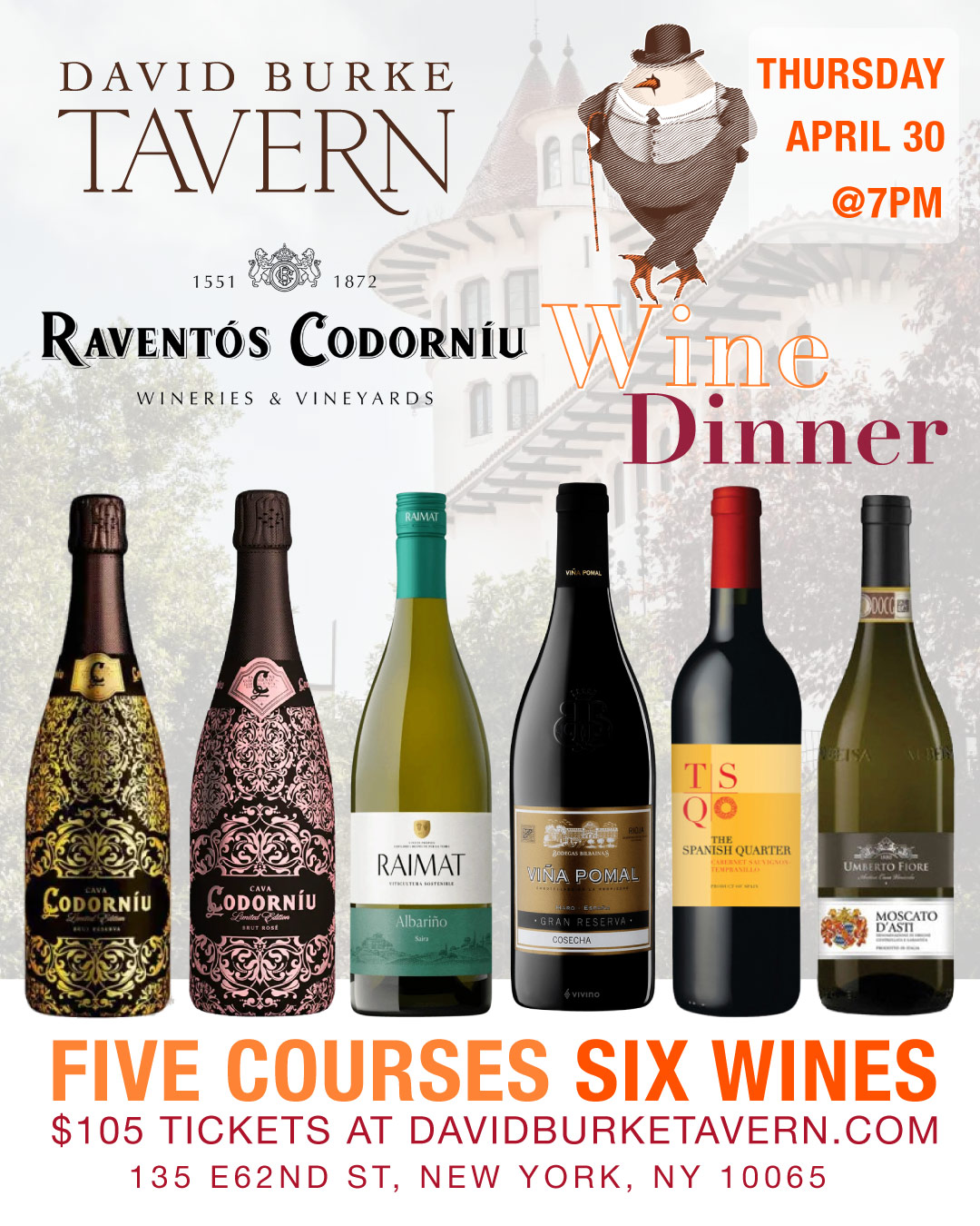Raventós Codorníu, Spain’s oldest producer of Wines and Cavas. The company has a history spanning over five centuries, dating back to 1551. Experience David Burke Tavern Chef’s Menu paired with delectable Spanish wine selections. Six wines will be poured, made from different grape varietals presented with tasting notes at each course.