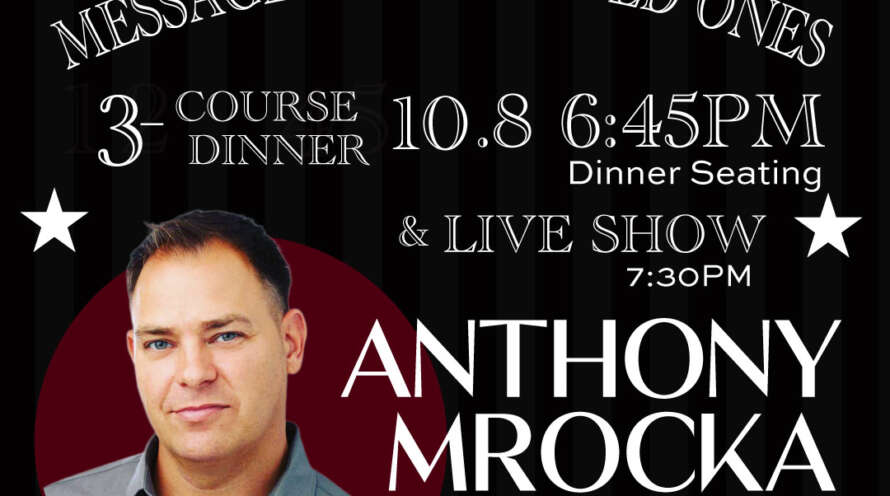 Wednesday, October 8, 2025 An Evening With Spirit Message from Loved Ones 3-Course Dinner & A Show Featuring Anthony Mrocka Celebrity Psychic Medium Dinner Seating at 6:45pm; Please arrive promptly Anthony’s Show starts at 7:30PM $125 per person (plus tax and tip)* TICKETS Join Anthony for an evening of spirit…...